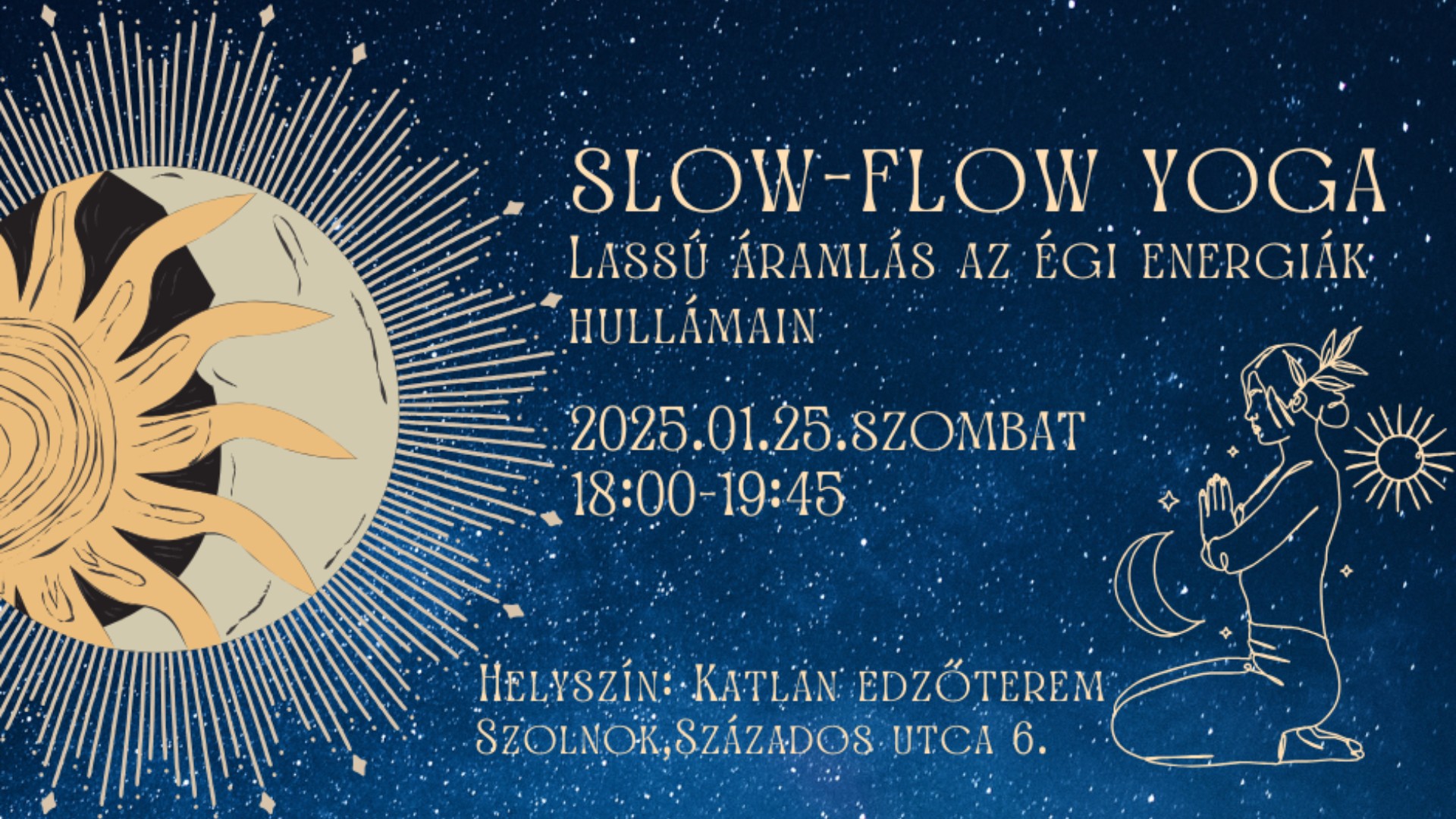 Csatlakozz hozzánk erre az egyedi jógaestére, ahol testünk és lelkünk finoman összhangba kerülhet az égi hullámokkal. A lassú, áramló mozdulatok, a mély légzés és a bolygók energiája segít a belső béke és a harmónia megtalálásában.